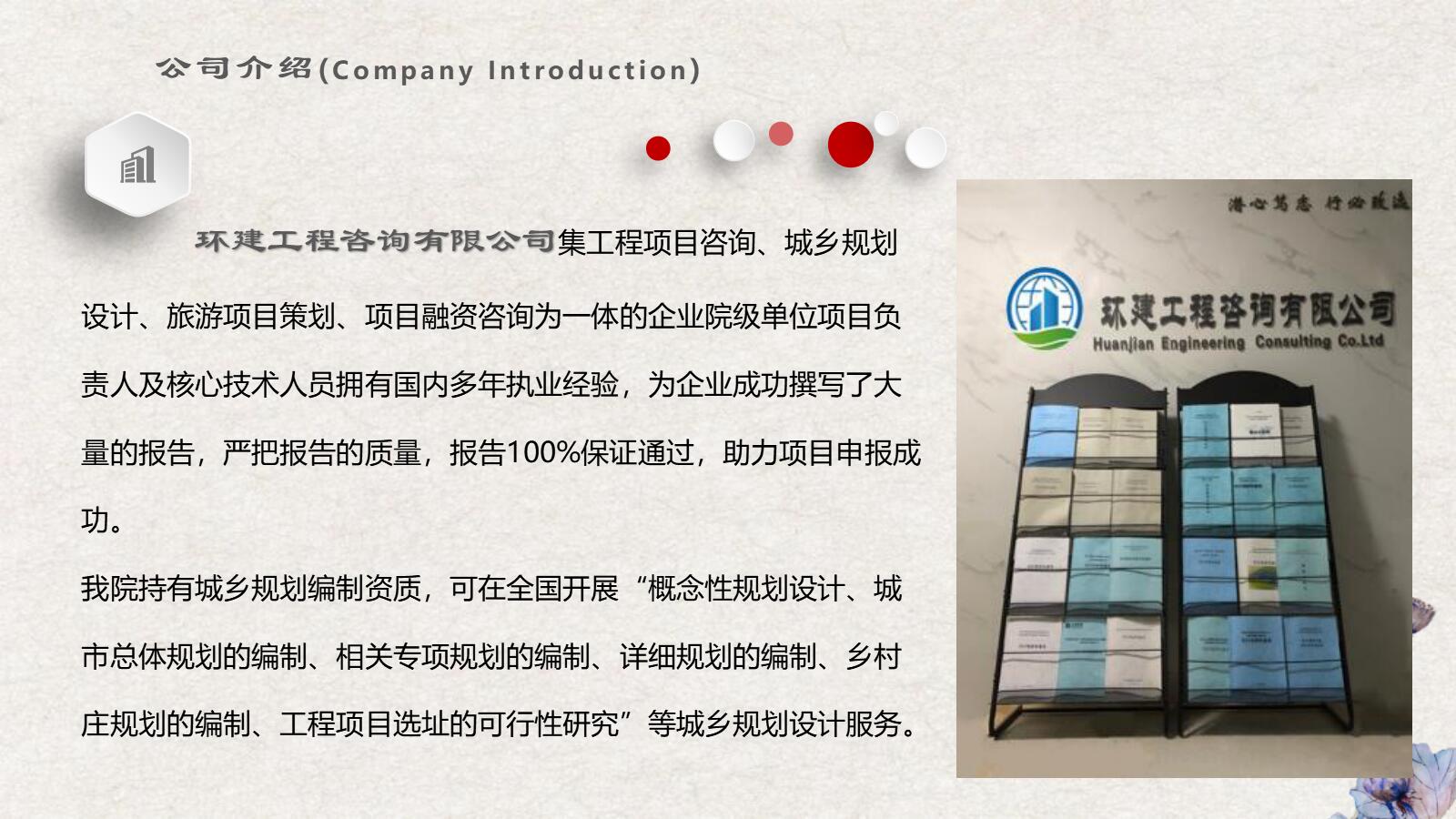 环建工程咨询有限公司是一家报告编写机构。公司所服务的客户涉及电子、生物、通讯、餐饮、家装、建材、房地产、零服装、制造、信息、汽车、等等众多行业,秉承服务至上,信誉的服务原则,坚持以质量赢得客户。公司主营业务:写可行性报告、商业计划书、项目建议书、项目申请报告、节能评估报告、制作鸟瞰图、平面图、概念规划设计等业务。公司拥有自己的数据库,拥有前数据库数据,确保资料的性。拥有强大的文案编写团队,来确保每一个项目的报告质量。