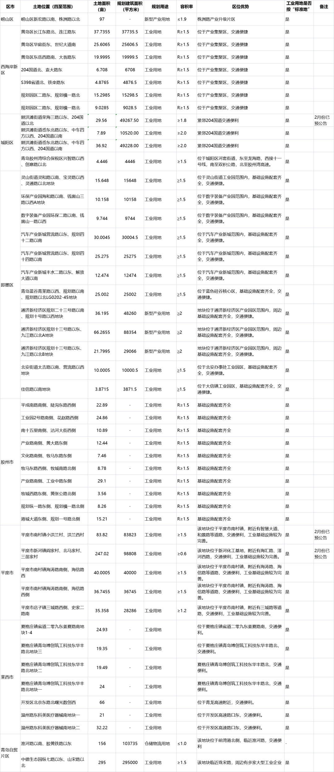 原标题:【选址必看】约1584亩!3月份山东青岛将“上新”44宗工业用地